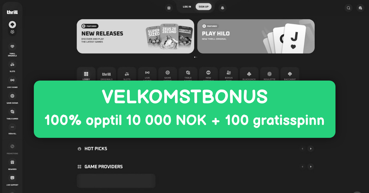 Thrill tilbyr ikke en tradisjonell velkomstbonus med matchprosent, gratis spinn eller en no deposit bonus ved registrering. I stedet bygges verdien gjennom et XP-/rakeback-system der deler av innsatsene gradvis gir tilbake i form av daglig/ukentlig cashback-lignende fordeler og nivåoppgraderinger. Fordelen med denne modellen er at den typisk har lavere skjulte taksinger enn klassiske bonuspakker. Ulempen er fraværet av et stort startløft som f.eks. "100% opptil X NOK + Y gratis spinn".